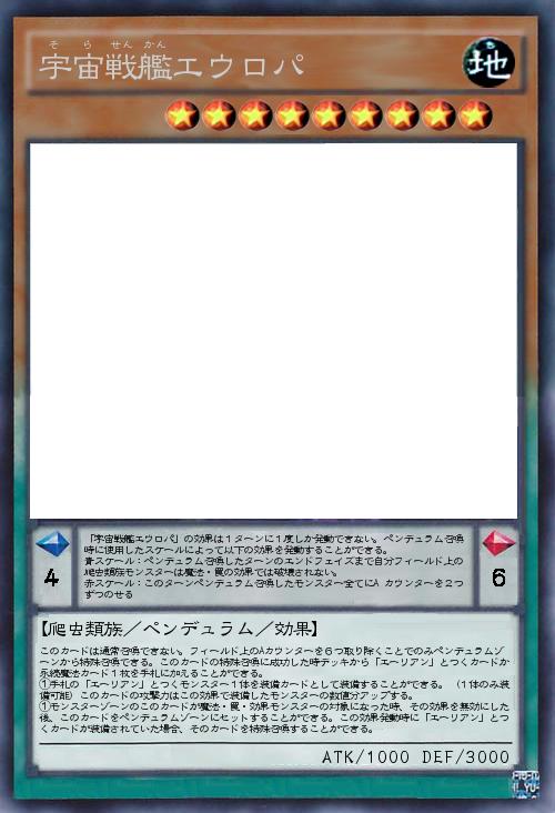 | 「宇宙戦艦エウロパ」の効果は1ターンに1度しか発動できない。ペンデュラム召喚時に使用したスケールによって以下の効果を発動することができる。 青スケール:ペンデュラム召喚したターンのエンドフェイズまで自分フィールド上の爬虫類族モンスターは魔法・罠の効果では破壊されない。 赤スケール:このターンペンデュラム召喚したモンスター全てにAカウンターを2つずつのせる | |||