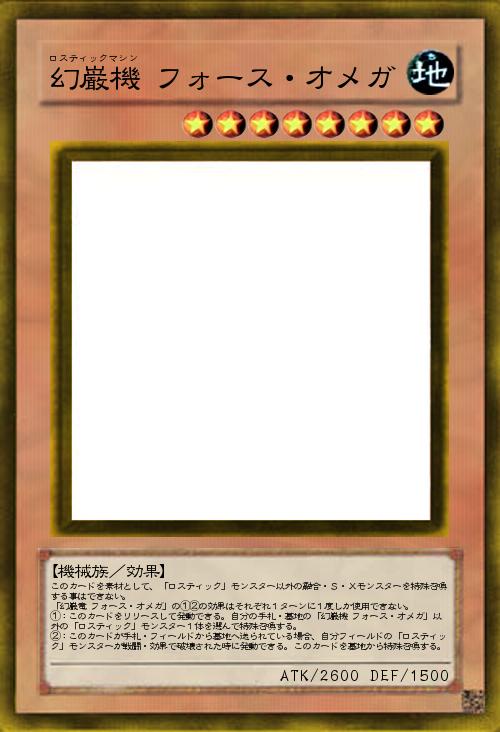 | このカードを素材として、「ロスティック」モンスター以外の融合・S・Xモンスターを特殊召喚する事はできない。 「幻巌竜 フォース・オメガ」の①②の効果はそれぞれ1ターンに1度しか使用できない。 ①:このカードをリリースして発動できる。自分の手札・墓地の「幻巌機 フォース・オメガ」以外の「ロスティック」モンスター1体を選んで特殊召喚する。 ②:このカードが手札・フィールドから墓地へ送られている場合、自分フィールドの「ロスティック」モンスターが戦闘・効果で破壊された時に発動できる。このカードを墓地から特殊召喚する。 | |||