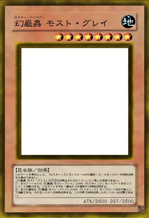 | このカードを素材として、「ロスティック」モンスター以外の融合・S・Xモンスターを特殊召喚する事はできない。 「幻巌蟲 モスト・グレイ」の①②の効果はそれぞれ1ターンに1度しか使用できない。 ①:自分フィールドの「幻巌蟲 モスト・グレイ」以外の「ロスティック」モンスター1体をリリースして発動できる。このカードを手札・墓地から守備表示で特殊召喚する。 ②:自分の墓地の「幻巌蟲 モスト・グレイ」以外の「ロスティック」モンスター1体を対象として発動できる。そのモンスターを特殊召喚する。この効果で特殊召喚したモンスターは攻撃できない。 | |||