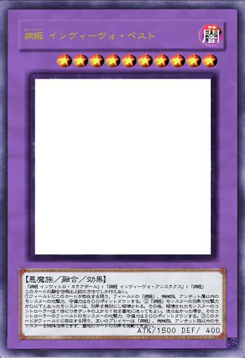 | 「病姫 インヴィトロ・カラアザール」+「病姫 インヴィーヴォ・アンスラクス」+「病姫」 このカードの融合召喚は上記の方法でしか行えない。 ①フィールドにこのカードが存在する限り、フィールドの「病姫」、機械族、アンデット属以外のモンスターの攻撃力、守備力は600ポイントダウンする。②「病姫」モンスターの効果で攻撃力が0以下となったモンスターは、効果を無効にし破壊される。その後、破壊されたモンスターのコントローラーは1体につきデッキの上から1枚を墓地に送ってもよい。送らなかった場合、そのコントローラーのフィールドのモンスターの攻撃力、守備力は300ポイントダウンする。③このカードがフィールドに存在する限り、互いのプレイヤーは「病姫」、機械族、アンデット族以外のモンスターを特殊召喚できず、墓地のカードの効果も発動できない。 | |||