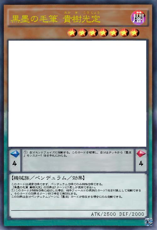| このカードは通常召喚できず、ペンデュラム召喚でのみ特殊召喚できる。 「黒墨の毛筆 貴樹光定」の効果は1ターンに1度しか使用できない。 ①:このカードが特殊召喚に成功した場合、相手フィールドの表側のカード1枚を対象として発動できる。そのカードの効果をターン終了時まで無効化する。 この効果は自分ペンデュラムゾーンに「墨液」カードが存在する場合にのみ発動できる。 | |||