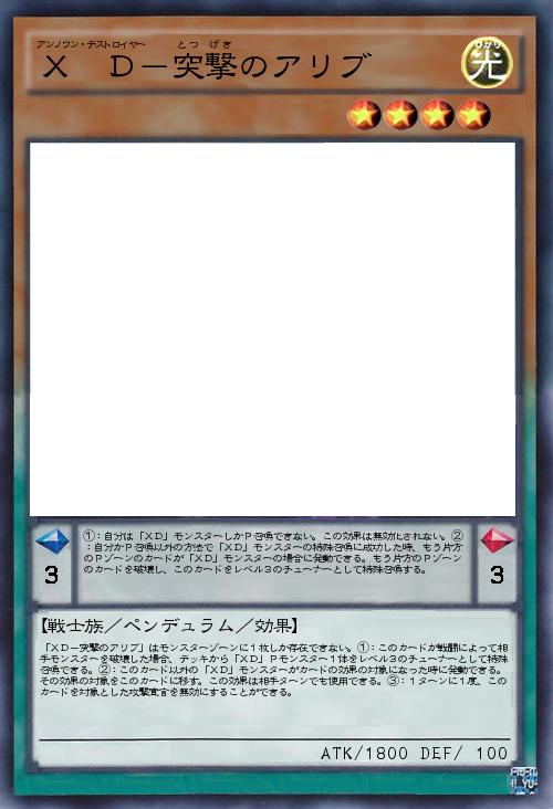 | 「XD-突撃のアリブ」はモンスターゾーンに1枚しか存在できない。①:このカードが戦闘によって相手モンスターを破壊した場合、デッキから「XD」Pモンスター1体をレベル3のチューナーとして特殊召喚できる。②:このカード以外の「XD」モンスターがカードの効果の対象になった時に発動できる。その効果の対象をこのカードに移す。この効果は相手ターンでも使用できる。③:1ターンに1度、このカードを対象とした攻撃宣言を無効にすることができる。 | |||