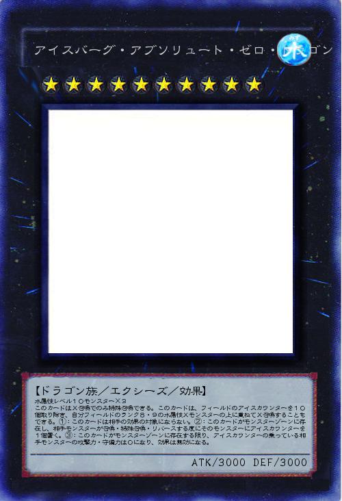 | 水属性レベル10モンスター×3 このカードはX召喚でのみ特殊召喚できる。このカードは、フィールドのアイスカウンターを10個取り除き、自分フィールドのランク8・9の水属性Xモンスターの上に重ねてX召喚することもできる。①:このカードは相手の効果の対象にならない。②:このカードがモンスターゾーンに存在し、相手モンスターが召喚・特殊召喚・リバースする度にそのモンスターにアイスカウンターを1個置く。③:このカードがモンスターゾーンに存在する限り、アイスカウンターの乗っている相手モンスターの攻撃力・守備力は0になり、効果は無効になる。 | |||