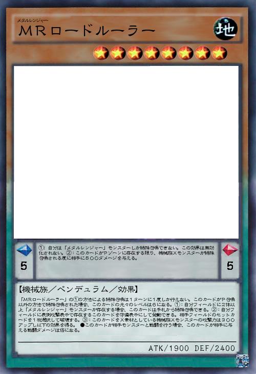 | 「MRロードルーラー」の①の方法による特殊召喚は1ターンに1度しか行えない。このカードがP召喚以外の方法で特殊召喚された場合、このカードの元々のレベルは6になる。①:自分フィールドに2体以上「メタルレンジャー」モンスターが存在する場合、このカードは手札から特殊召喚できる。②:自分フィールドに表側攻撃表示で存在するこのカードを守備表示にして発動できる。相手フィールドのセットカードを1枚選択して破壊する。③:このカードをX素材としている機械族Xモンスターの攻撃力は300アップし以下の効果を得る。 ●このカードが相手モンスターと戦闘を行う場合、このカードが相手に与える戦闘ダメージは倍になる。 | |||