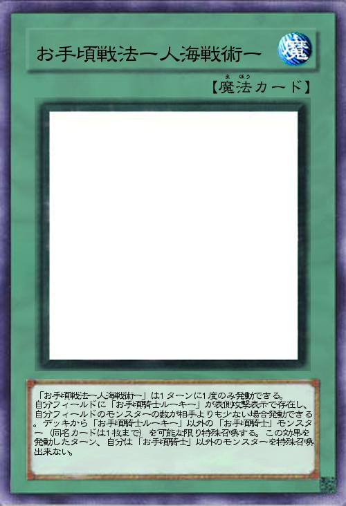 | 「お手頃戦法ー人海戦術ー」は1ターンに1度のみ発動できる。 自分フィールドに「お手頃騎士ルーキー」が表側攻撃表示で存在し、自分フィールドのモンスターの数が相手よりも少ない場合発動できる。デッキから「お手頃騎士ルーキー」以外の「お手頃騎士」モンスター(同名カードは1枚まで)を可能な限り特殊召喚する。この効果を発動したターン、自分は「お手頃騎士」以外のモンスターを特殊召喚出来ない。 | |||