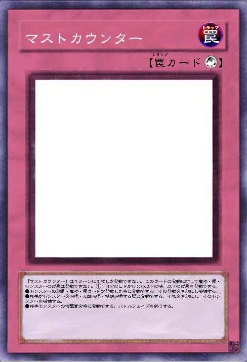 | 「マストカウンター」は1ターンに1枚しか発動できない。このカードの発動に対して魔法・罠・モンスターの効果は発動できない。①:自分のLPが800以下の時、以下の効果を発動できる。 ●モンスターの効果・魔法・罠カードが発動した時に発動できる。その発動を無効にし破壊する。 ●相手がモンスターを召喚・反転召喚・特殊召喚する際に発動できる。それを無効にし、そのモンスターを破壊する。 ●相手モンスターの攻撃宣言時に発動できる。バトルフェイズを終了する。 | |||