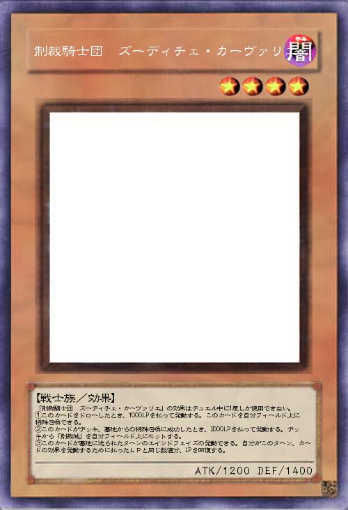 | 「制裁騎士団 ズーディチェ・カーヴァリエ」の効果はデュエル中に1度しか使用できない。 ①このカードをドローしたとき、1000LPを払って発動する。このカードを自分フィールド上に特殊召喚できる。 ②このカードがデッキ、墓地からの特殊召喚に成功したとき、2000LPを払って発動する。デッキから「制裁城」を自分フィールド上にセットする。 ③このカードが墓地に送られたターンのエインドフェイズの発動できる。自分がこのターン、カードの効果を発動するために払ったLPと同じ数値分、LPを回復する。 | |||