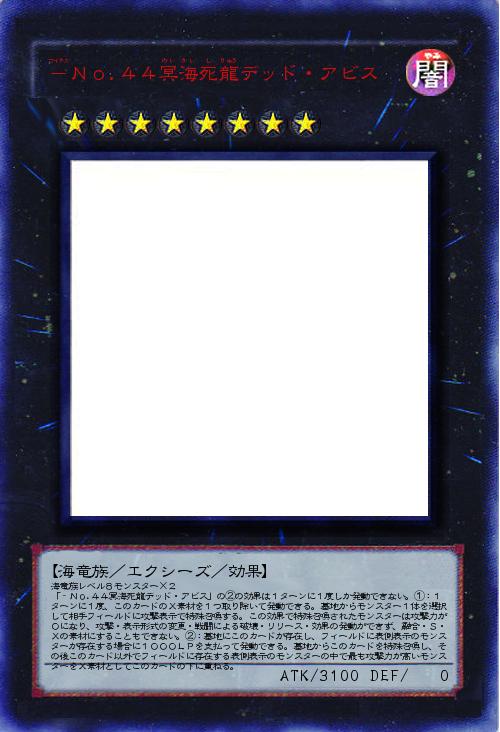 | 海竜族レベル8モンスター×2 「‐No.44冥海死龍デッド・アビス」の②の効果は1ターンに1度しか発動できない。①:1ターンに1度、このカードのX素材を1つ取り除いて発動できる。墓地からモンスター1体を選択して相手フィールドに攻撃表示で特殊召喚する。この効果で特殊召喚されたモンスターは攻撃力が0になり、攻撃・表示形式の変更・戦闘による破壊・リリース・効果の発動ができず、融合・S・Xの素材にすることもできない。②:墓地にこのカードが存在し、フィールドに表側表示のモンスターが存在する場合に1000LPを支払って発動できる。墓地からこのカードを特殊召喚し、その後このカード以外でフィールドに存在する表側表示のモンスターの中で最も攻撃力が高いモンスターをX素材としてこのカードの下に重ねる。 | |||