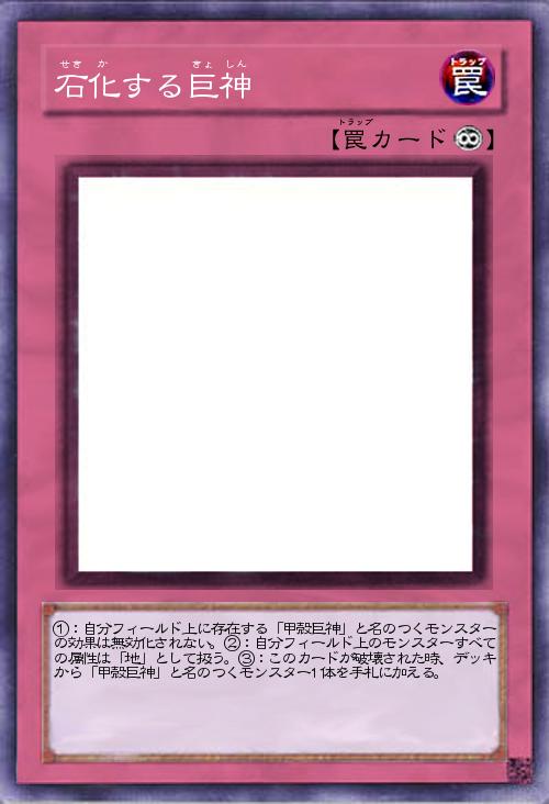 | ①:自分フィールド上に存在する「甲殻巨神」と名のつくモンスターの効果は無効化されない。②:自分フィールド上のモンスターすべての属性は「地」として扱う。③:このカードが破壊された時、デッキから「甲殻巨神」と名のつくモンスター1体を手札に加える。 | |||