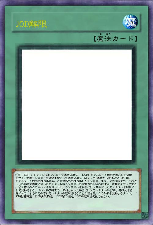 | ①:「JOD」アンデット族モンスターを墓地に送り、「JOD」モンスター1体を対象として発動できる。対象モンスターを融合素材として墓地に送り、EXデッキ・墓地から条件に合った「BL」モンスター1体を特殊召喚する。この効果で特殊召喚したモンスターはターン終了時まで、このカードの効果で墓地に送ったアンデット族モンスターの攻撃力の半分の数値分、攻撃力をアップする。②:墓地のこのカードを除外し「BL」モンスターを融合・S・X素材にしたモンスターを対象にして発動できる。ターン終了時まで、素材となった融合・S・Xモンスターの攻撃力・守備力を自身に加え、さらにその素材モンスターの効果を得ることができる。この効果を発動するターン、「JOD最適降臨」「JOD勇気昇格」「JOD闇の混沌」の②の効果を発動できない。 | |||