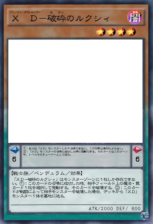 | 「XD-破砕のルクシィ」はモンスターゾーンに1枚しか存在できな い。①:このカードの召喚に成功した時、相手フィールド上の魔法・罠カード1枚を選択して発動する。そのカードを破壊する。②:このカードが戦闘によって相手モンスターを破壊した場合、デッキから「XD」モンスター1体を墓地に送る。 | |||