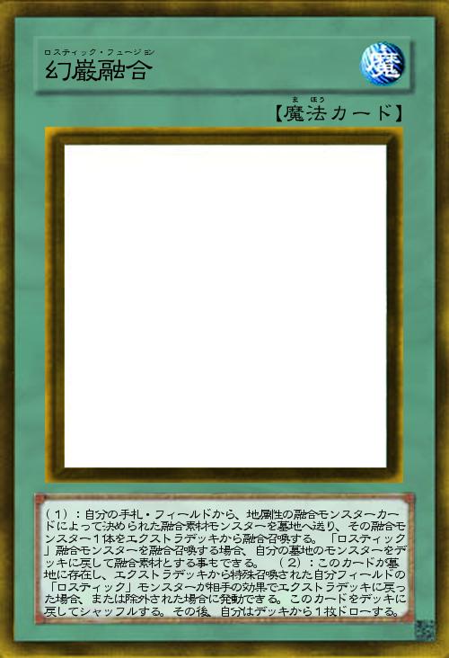 | (1):自分の手札・フィールドから、地属性の融合モンスターカードによって決められた融合素材モンスターを墓地へ送り、その融合モンスター1体をエクストラデッキから融合召喚する。「ロスティック」融合モンスターを融合召喚する場合、自分の墓地のモンスターをデッキに戻して融合素材とする事もできる。 (2):このカードが墓地に存在し、エクストラデッキから特殊召喚された自分フィールドの「ロスティック」モンスターが相手の効果でエクストラデッキに戻った場合、または除外された場合に発動できる。このカードをデッキに戻してシャッフルする。その後、自分はデッキから1枚ドローする。 | |||