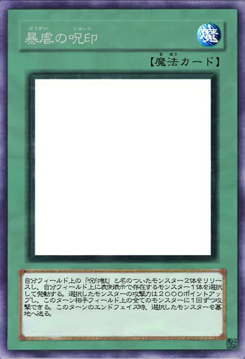 | 自分フィールド上の「呪印獣」と名のついたモンスター2体をリリースし、自分フィールド上に表側表示で存在するモンスター1体を選択して発動する。選択したモンスターの攻撃力は2000ポイントアップし、このターン相手フィールド上の全てのモンスターに1回ずつ攻撃できる。このターンのエンドフェイズ時、選択したモンスターを墓地へ送る。 | |||