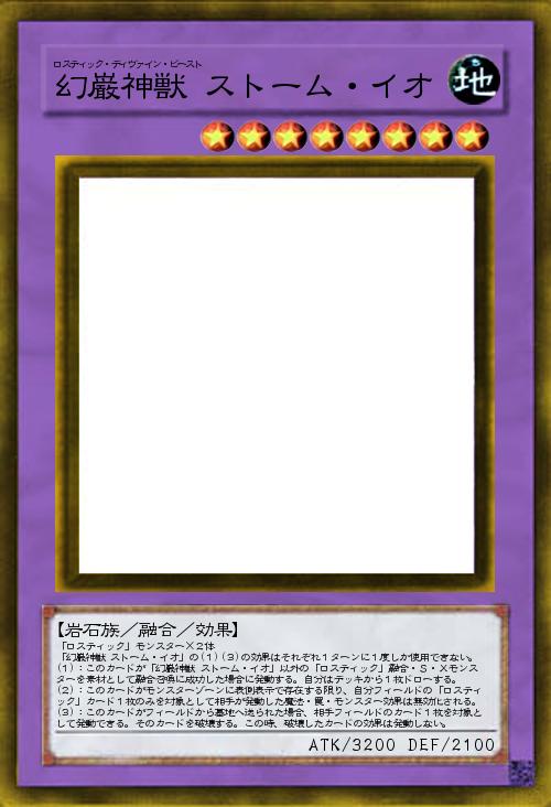 | 「ロスティック」モンスター×2体 「幻巌神獣 ストーム・イオ」の(1)(3)の効果はそれぞれ1ターンに1度しか使用できない。 (1):このカードが「幻巌神獣 ストーム・イオ」以外の「ロスティック」融合・S・Xモンスターを素材として融合召喚に成功した場合に発動する。自分はデッキから1枚ドローする。 (2):このカードがモンスターゾーンに表側表示で存在する限り、自分フィールドの「ロスティック」カード1枚のみを対象として相手が発動した魔法・罠・モンスター効果は無効化される。 (3):このカードがフィールドから墓地へ送られた場合、相手フィールドのカード1枚を対象として発動できる。そのカードを破壊する。この時、破壊したカードの効果は発動しない。 | |||