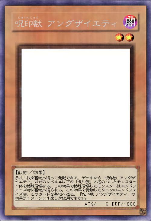 | 手札1枚を墓地へ送って発動できる。デッキから「呪印獣 アングザイエティ」以外のレベル4以下の「呪印獣」と名のついたモンスター1体を特殊召喚する。この効果で特殊召喚したモンスターはエンドフェイズ時に墓地へ送られる。この効果を発動したターンのエンドフェイズ時、このカードを墓地へ送る。「呪印獣 アングザイエティ」の効果は1ターンに1度しか使用できない。 | |||