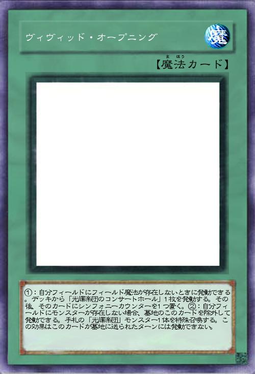 | ①:自分フィールドにフィールド魔法が存在しないときに発動できる。デッキから「光輝楽団のコンサートホール」1枚を発動する。その後、そのカードにシンフォニーカウンターを1つ置く。②:自分フィールドにモンスターが存在しない場合、墓地のこのカードを除外して発動できる。手札の「光輝楽団」モンスター1体を特殊召喚する。この効果はこのカードが墓地に送られたターンには発動できない。 | |||