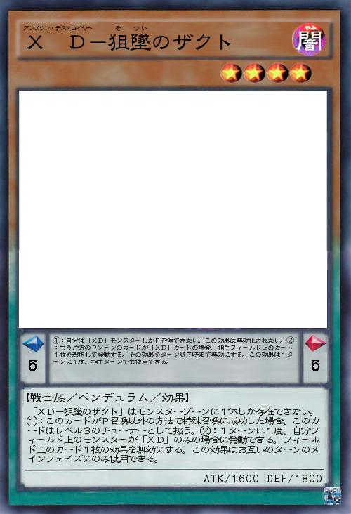 | 「XD-狙墜のザクト」はモンスターゾーンに1体しか存在できない。①:このカードがP召喚以外の方法で特殊召喚に成功した場合、このカードはレベル3のチューナーとして扱う。②:1ターンに1度、自分フィールド上のモンスターが「XD」のみの場合に発動できる。フィールド上のカード1枚の効果を無効にする。この効果はお互いのターンのメインフェイズにのみ使用できる。 | |||
