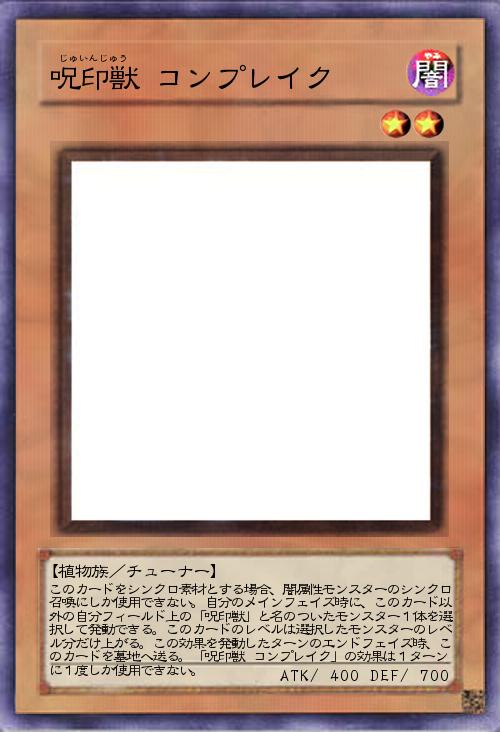 | このカードをシンクロ素材とする場合、闇属性モンスターのシンクロ召喚にしか使用できない。自分のメインフェイズ時に、このカード以外の自分フィールド上の「呪印獣」と名のついたモンスター1体を選択して発動できる。このカードのレベルは選択したモンスターのレベル分だけ上がる。この効果を発動したターンのエンドフェイズ時、このカードを墓地へ送る。「呪印獣 コンプレイク」の効果は1ターンに1度しか使用できない。 | |||