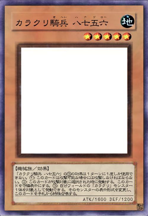 | 「カラクリ騎兵 八七五六」の③の効果は1ターンに1度しか使用できない。①:このカードは攻撃可能な場合には攻撃しなければならない。②:このカードが攻撃対象に選択された時に発動する。このカードを守備表示にする。③:自分フィールドの「カラクリ」モンスター1体を対象として発動できる。そのモンスターの表示形式を変更し、このカードを手札から特殊召喚する。 | |||