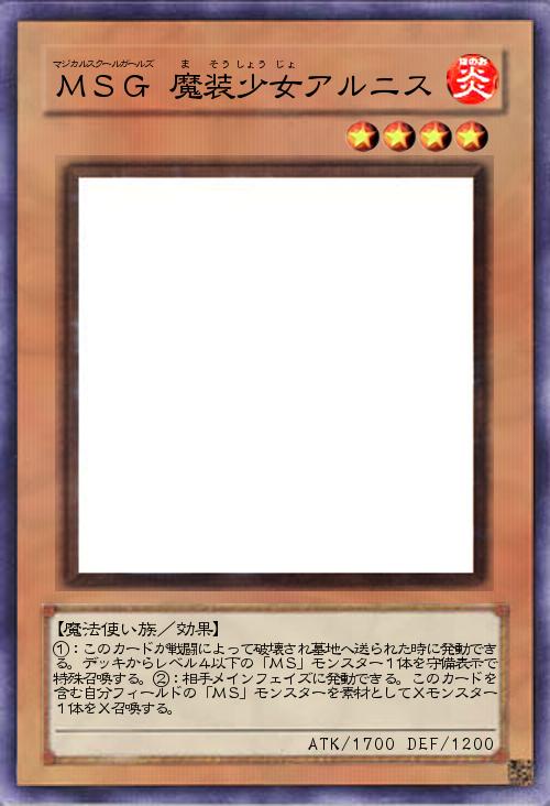 モデルは魔装戦士 アルニスです。関連性のある朱雀の召喚士が好きだったのですが、効果の問題でアルニスの効果を採用しました。魔装少女って、響きが良いですね。」(2016-03-02 01:23)