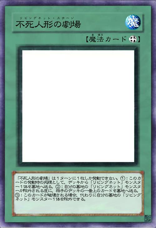 | 「不死人形の劇場」は1ターンに1枚しか発動できない。①:このカードの発動時の処理として、デッキから「リビングネット」モンスター1体を墓地へ送る。②:自分の墓地の「リビングネット」モンスターが除外される度に、相手のデッキの一番上のカードを墓地へ送る。③:このカードが破壊される場合、代わりに自分の墓地の「リビングネット」モンスター1体を除外できる。 | |||