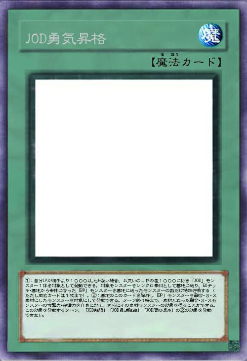| ①:自分LPが相手より1000以上少ない場合、お互いのLPの差1000に付き「JOD」モンスター1体を対象として発動できる。対象モンスターをシンクロ素材として墓地に送り、EXデッキ・墓地から条件に合った「BP」モンスターを墓地に送ったモンスターの数だけ特殊召喚する(ただし同名カードは1枚まで)。②:墓地のこのカードを除外し「BP」モンスターを融合・S・X素材にしたモンスターを対象にして発動できる。ターン終了時まで、素材となった融合・S・Xモンスターの攻撃力・守備力を自身に加え、さらにその素材モンスターの効果を得ることができる。この効果を発動するターン、「JOD解限」「JOD最適降臨」「JOD闇の混沌」の②の効果を発動できない。 | |||
