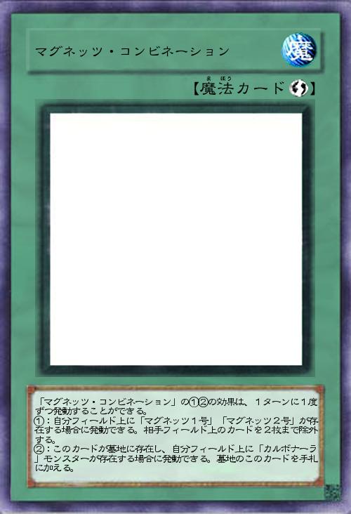 | 「マグネッツ・コンビネーション」の①②の効果は、1ターンに1度ずつ発動することができる。 ①:自分フィールド上に「マグネッツ1号」「マグネッツ2号」が存在する場合に発動できる。相手フィールド上のカードを2枚まで除外する。 ②:このカードが墓地に存在し、自分フィールド上に「カルボナーラ」モンスターが存在する場合に発動できる。墓地のこのカードを手札に加える。 | |||