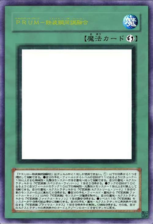 | 「PRUM-鉄装鋼同調融合」はデュエル中に1枚しか使用できない。①:以下の効果から1つを選択して発動できる。●自分の手札・フィールドからレベルの合計が11になるようにチューナー1体以上を含む機械族・光属性モンスター5体を墓地へ送って発動できる。自分の墓地・エクストラデッキから「可変装鋼 スペリオル・ワイバーン」1体をS召喚する。●ランクの合計が10になるように自分フィールドのランク10以下の機械族・光属性Xモンスター1体以上を対象として発動できる。自分の墓地・エクストラデッキから「可変装鋼 エクストリーム・ソード」1体を対象のモンスターの上に重ねてX召喚する。●自分の手札・フィールド・墓地から「可変装鋼 ファイナル・キャノン」以外の「可変装鋼」モンスター3種類を除外し、自分の墓地・エクストラデッキから「可変装鋼 ファイナル・キャノン」1体を融合召喚する。●レベル11の「可変装鋼」モンスター | |||