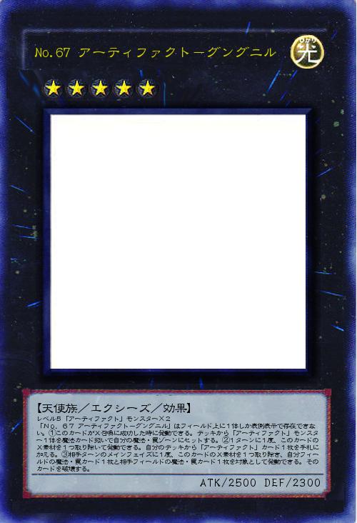 | レベル5「アーティファクト」モンスター×2 「No.67 アーティファクト-グングニル」はフィールド上に1体しか表側表示で存在できない。①このカードがX召喚に成功した時に発動できる。デッキから「アーティファクト」モンスター1体を魔法カード扱いで自分の魔法・罠ゾーンにセットする。②1ターンに1度、このカードのX素材を1つ取り除いて発動できる。自分のデッキから「アーティファクト」カード1枚を手札に加える。③相手ターンのメインフェイズに1度、このカードのX素材を1つ取り除き、自分フィールドの魔法・罠カード1枚と相手フィールドの魔法・罠カード1枚を対象として発動できる。そのカードを破壊する。 | |||