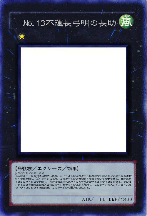 「なんだか貧乏神みたいな-No.。初期デッキ40枚、後攻1ターン目でコイツを出して効果を死ぬ気と強運(または出たら目)をもって使えば2の17乗×50=6553600の攻撃力で殴れる!倍々ゲームは恐ろしい。」(2016-03-05 08:13)