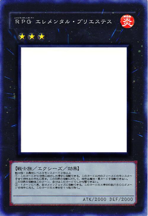 | 戦士族・炎属性レベル3モンスター×2体以上 ①:このカードがX召喚に成功した場合に発動できる。このカード以外のフィールドのモンスターを全て持ち主の手札に戻す。この効果の発動に対して、相手は魔法・罠カードを発動できない。 この効果の発動後このターン、自分はこのカードでしか攻撃できない。 ②:1ターンに1度、自分メインフェイズに発動できる。このカードのX素材の数×600ダメージを相手に与え、このカードのX素材を1つ取り除く。 | |||