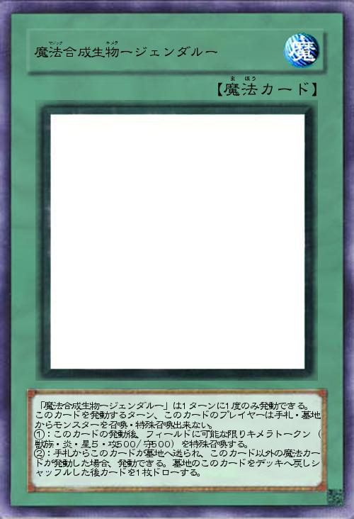 | 「魔法合成生物ージェンダルー」は1ターンに1度のみ発動できる。 このカードを発動するターン、このカードのプレイヤーは手札・墓地からモンスターを召喚・特殊召喚出来ない。 ①:このカードの発動後、フィールドに可能な限りキメラトークン(獣族・炎・星5・攻500/守500)を特殊召喚する。 ②:手札からこのカードが墓地へ送られ、このカード以外の魔法カードが発動した場合、発動できる。墓地のこのカードをデッキへ戻しシャッフルした後カードを1枚ドローする。 | |||