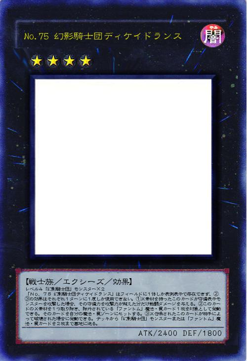 | レベル4「幻影騎士団」モンスター×2 「No.75 幻影騎士団ディケイドランス」はフィールドに1体しか表側表示で存在できず、②③の効果はそれぞれ1ターンに1度しか使用できない。①X素材を持ったこのカードが守備表示モンスターを攻撃した場合、その守備力を攻撃力が超えた分だけ戦闘ダメージを与える。②このカードのX素材を1つ取り除き、除外されている「ファントム」魔法・罠カード1枚を対象として発動できる。そのカードを自分の魔法・罠ゾーンにセットする。③X召喚されたこのカードが相手によって破壊された場合に発動できる。デッキから「幻影騎士団」モンスターまたは「ファントム」魔法・罠カードを2枚まで墓地に送る。 | |||