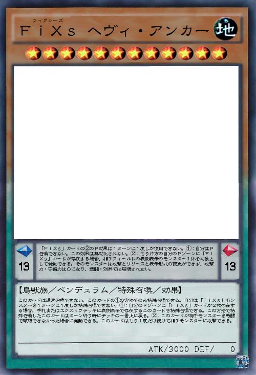| 「FiXs」カードの②のP効果は1ターンに1度しか使用できない。①:自分はP召喚できない。この効果は無効化されない。②:もう片方の自分のPゾーンに「FiXs」カードが存在する場合、相手フィールドの表側表示のモンスター1体を対象として発動できる。そのモンスターは攻撃とリリースと表示形式の変更ができず、攻撃力・守備力は0になり、戦闘・効果では破壊されない。 | |||