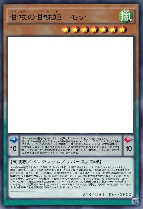| 「甘攻の甘味姫モナ」の(2)の効果は1ターンに1度しか使用できない。(1):自分は「甘味姫」モンスターしか特殊召喚できない。(2):800LP払って発動できる。Pゾーンのこのカードを破壊し、自分のデッキからレベル4以下の風属性・天使族モンスター1体を手札に加える。この効果で手札に加えたモンスターが「甘味姫」モンスターだった場合相手にこの効果でドローした「甘味姫」モンスターを相手に見せる事で自分のデッキから1枚ドローできる。 | |||