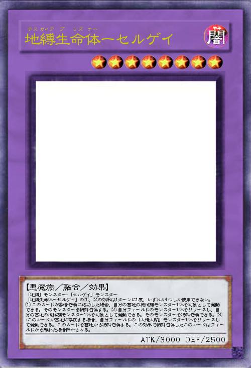 | 「地縛」モンスター+「セルゲイ」モンスター 「地縛生命体ーセルゲイ」の①、②の効果は1ターンに1度、いずれか1つしか使用できない。 ①:このカードが融合召喚に成功した場合、自分の墓地の機械族モンスター1体を対象として発動できる。そのモンスターを特殊召喚する。②:自分フィールドのモンスター1体をリリースし、自分の墓地の機械族モンスター1体を対象として発動できる。そのモンスターを特殊召喚できる。③:このカードが墓地に存在する場合、自分フィールドの「人造人間」モンスター1体をリリースして発動できる。このカードを墓地から特殊召喚する。この効果で特殊召喚したこのカードはフィールドから離れた場合除外される。 | |||