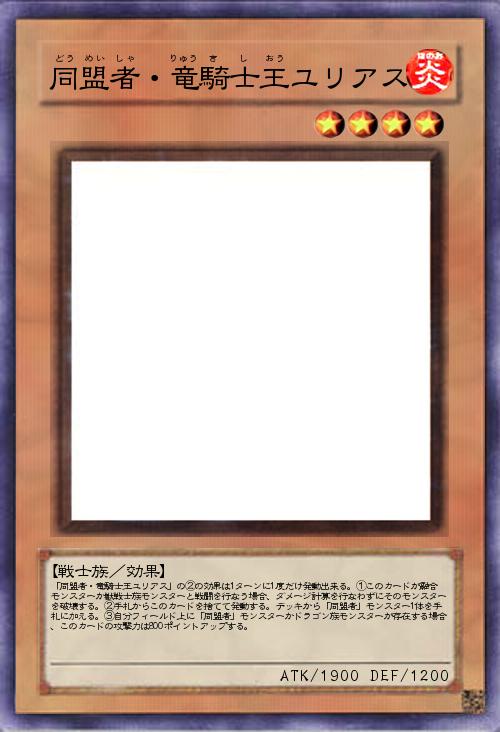 | 「同盟者・竜騎士王ユリアス」の②の効果は1ターンに1度だけ発動出来る。①このカードが融合モンスターか獣戦士族モンスターと戦闘を行なう場合、ダメージ計算を行なわずにそのモンスターを破壊する。②手札からこのカードを捨てて発動する。デッキから「同盟者」モンスター1体を手札に加える。③自分フィールド上に「同盟者」モンスターかドラゴン族モンスターが存在する場合、このカードの攻撃力は800ポイントアップする。 | |||