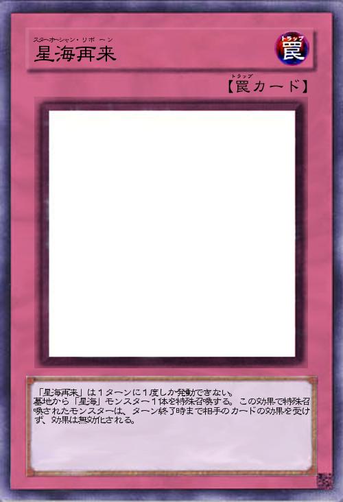 | 「星海再来」は1ターンに1度しか発動できない。 墓地から「星海」モンスター1体を特殊召喚する。この効果で特殊召喚されたモンスターは、ターン終了時まで相手のカードの効果を受けず、効果は無効化される。 | |||