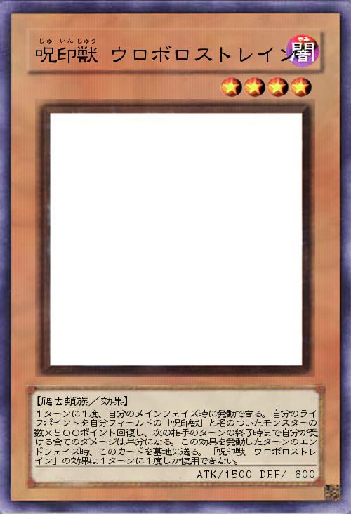 | 1ターンに1度、自分のメインフェイズ時に発動できる。自分のライフポイントを自分フィールドの「呪印獣」と名のついたモンスターの数×500ポイント回復し、次の相手のターンの終了時まで自分が受ける全てのダメージは半分になる。この効果を発動したターンのエンドフェイズ時、このカードを墓地に送る。「呪印獣 ウロボロストレイン」の効果は1ターンに1度しか使用できない。 | |||