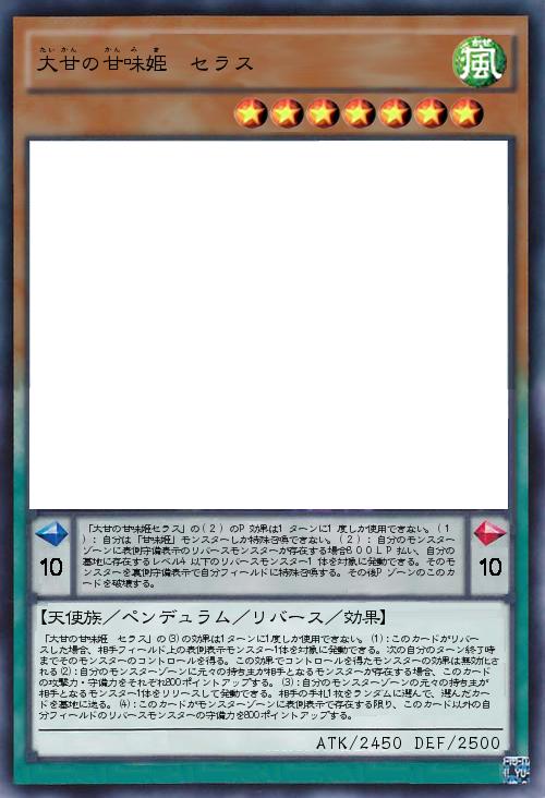 | 「大甘の甘味姫 セラス」の(3)の効果は1ターンに1度しか使用できない。(1):このカードがリバースした場合、相手フィールド上の表側表示モンスター1体を対象に発動できる。次の自分のターン終了時までそのモンスターのコントロールを得る。この効果でコントロールを得たモンスターの効果は無効化される(2):自分のモンスターゾーンに元々の持ち主が相手となるモンスターが存在する場合、このカードの攻撃力・守備力をそれぞれ800ポイントアップする。(3):自分のモンスターゾーンの元々の持ち主が相手となるモンスター1体をリリースして発動できる。相手の手札1枚をランダムに選んで、選んだカードを墓地に送る。(4):このカードがモンスターゾーンに表側表示で存在する限り、このカード以外の自分フィールドのリバースモンスターの守備力を800ポイントアップする。 | |||