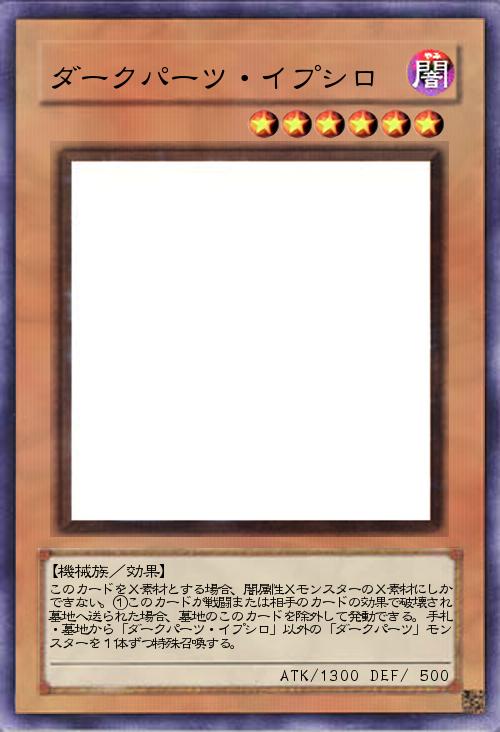 | このカードをX素材とする場合、闇属性XモンスターのX素材にしかできない。①このカードが戦闘または相手のカードの効果で破壊され墓地へ送られた場合、墓地のこのカードを除外して発動できる。手札・墓地から「ダークパーツ・イプシロ」以外の「ダークパーツ」モンスターを1体ずつ特殊召喚する。 | |||