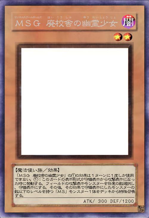| 「MSG 廃校舎の幽霊少女」の①の効果は1ターンに1度しか使用できない。①:このカードの表示形式が守備表示から攻撃表示になった時に発動する。フィールドの攻撃表示モンスターを任意の数選択し、守備表示にする。その後、その効果で守備表示にしたモンスターの数以下のレベルを持つ「MS」モンスター1体をデッキから特殊召喚する。 | |||