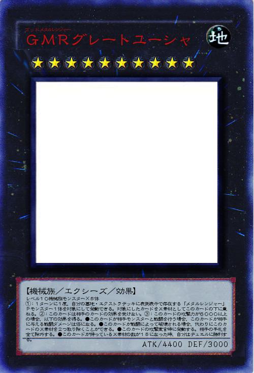 | レベル10機械族モンスター×5体 ①:1ターンに1度、自分の墓地・エクストラデッキに表側表示で存在する「メタルレンジャー」Pモンスター1体を対象にして発動できる。対象にしたカードをX素材としてこのカードの下に重ねる。②:このカードは相手のカードの効果を受けない。③:このカードの攻撃力が6000以上の場合、以下の効果を得る。●このカードが相手モンスターと戦闘を行う場合、このカードが相手に与える戦闘ダメージは倍になる。●このカードが戦闘によって破壊される場合、代わりにこのカードのX素材を2つ取り除くことができる。●このカードの攻撃宣言時に発動する。相手の手札を全て除外する。●このカードが持っているX素材の数が15になった時、自分はデュエルに勝利する。 | |||