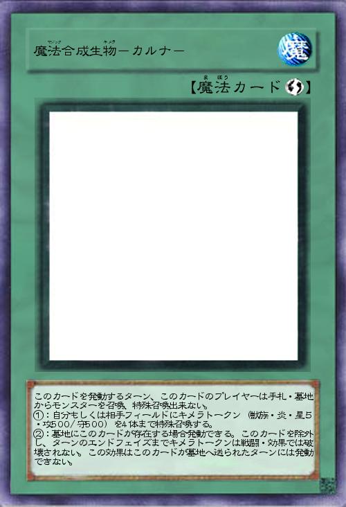 | このカードを発動するターン、このカードのプレイヤーは手札・墓地からモンスターを召喚、特殊召喚出来ない。 ①:自分もしくは相手フィールドにキメラトークン(獣族・炎・星5・攻500/守500)を4体まで特殊召喚する。 ②:墓地にこのカードが存在する場合発動できる。このカードを除外し、ターンのエンドフェイズまでキメラトークンは戦闘・効果では破壊されない。この効果はこのカードが墓地へ送られたターンには発動できない。 | |||