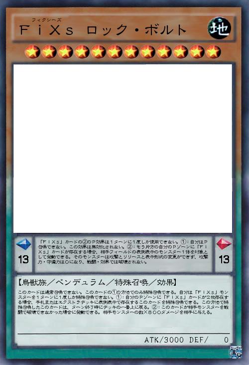 | このカードは通常召喚できない。このカードの①の方法でのみ特殊召喚できる。自分は「FiXs」モンスターを1ターンに1度しか特殊召喚できない。①:自分のPゾーンに「FiXs」カードが2枚存在する場合、手札またはエクストラデッキに表側表示で存在するこのカードを特殊召喚できる。この方法で特殊召喚したこのカードは、ターン終了時にデッキの一番上に戻る。②:このカードが相手モンスターを戦闘で破壊できなかった場合に発動できる。相手モンスターの数×800ダメージを相手に与える。 | |||
