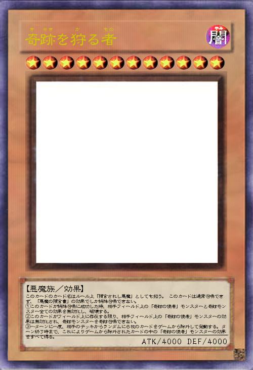 | このカードのカード名はルール上「預言されし悪魔」としても扱う。 このカードは通常召喚できず、「悪魔の預言書」の効果でしか特殊召喚できない。 ①このカードが特殊召喚に成功した時、相手フィールド上の「奇跡の使者」モンスターと奇跡モンスター全ての効果を無効化し、破壊する。 ②このカードがフィールド上に存在する限り、相手フィールド上の「奇跡の使者」モンスターの効果は無効化され、奇跡モンスターを奇跡召喚できない。 ③一ターンに一度、相手のデッキからランダムに6枚のカードをゲームから除外して発動する。ターン終了時まで、これによりゲームから除外されたカードの中の「奇跡の使者」モンスターの効果をすべて得る。 | |||