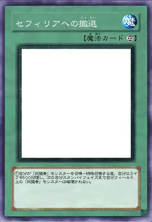 | ①自分が「同盟者」モンスターを召喚・特殊召喚する度、自分はライフを500回復し、次の自分スタンバイフェイズまで自分フィールド上の「同盟者」モンスターは破壊されない。 | |||