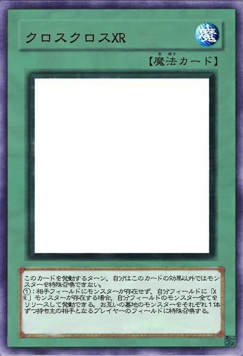| このカードを発動するターン、自分はこのカードの効果以外ではモンスターを特殊召喚できない。 ①:相手フィールドにモンスターが存在せず、自分フィールドに「XR」モンスターが存在する場合、自分フィールドのモンスター全てをリリースして発動できる。お互いの墓地のモンスターをそれぞれ1体ずつ持ち主の相手となるプレイヤーのフィールドに特殊召喚する。 | |||