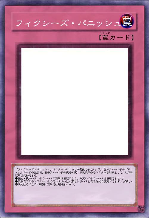 | 「フィクシーズ・パニッシュ」は1ターンに1枚しか発動できない。①:自分フィールドの「FiXs」カードの数まで、相手フィールドの魔法・罠・表側表示のモンスターを対象として、以下の効果を発動できる。 ●魔法・罠カード:そのカードの効果は無効になり、お互いにそのカードを使用できない。 ●表側表示のモンスター:そのモンスターは攻撃とリリースと表示形式の変更ができず、攻撃力・守備力は0になり、戦闘・効果では破壊されない。 | |||