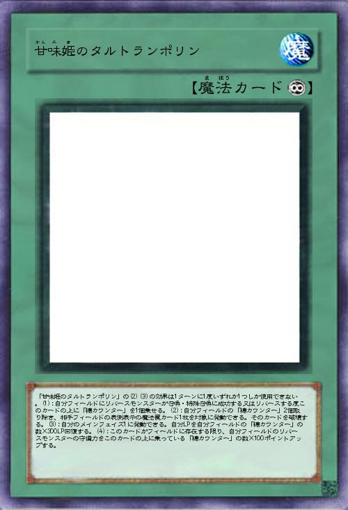| 「甘味姫のタルトランポリン」の(2)(3)の効果は1ターンに1度いずれか1つしか使用できない。(1):自分フィールドにリバースモンスターが召喚・特殊召喚に成功する又はリバースする度このカードの上に「糖カウンター」を1個乗せる。(2):自分フィールドの「糖カウンター」2個取り除き、相手フィールドの表側表示の魔法罠カード1枚を対象に発動できる。そのカードを破壊する。(3):自分のメインフェイズ1に発動できる。自分LPを自分フィールドの「糖カウンター」の数×300LP回復する。(4):このカードがフィールドに存在する限り、自分フィールドのリバースモンスターの守備力をこのカードの上に乗っている「糖カウンター」の数×100ポイントアップする。 | |||